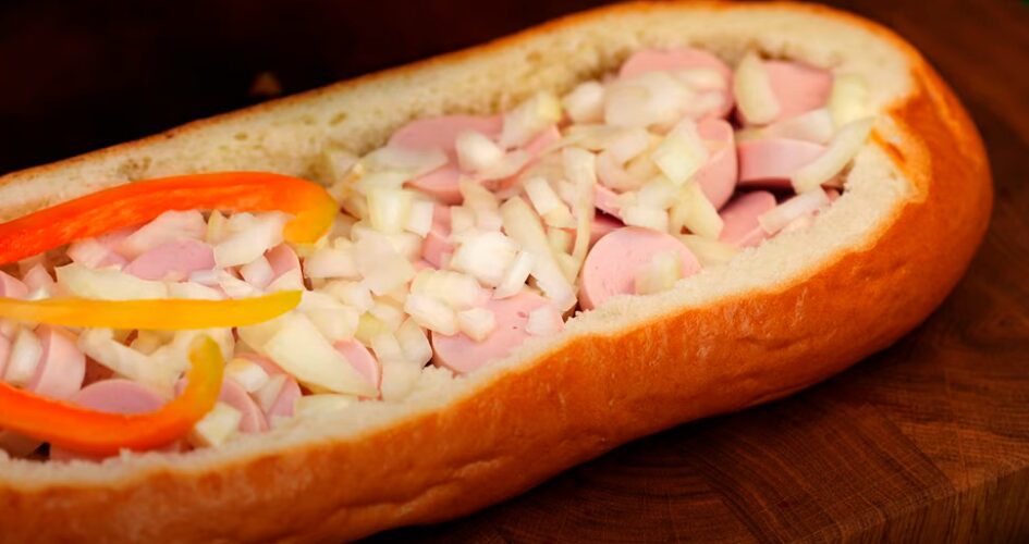 Сосиски наріжте кружальцями. Розкладіть їх у середину хлібини. Обчищену цибулину наріжте дрібними кубиками й посипте шматочки ковбаси. Половинку солодкого перцю позбавте насіння та наріжте тоненькою соломкою.