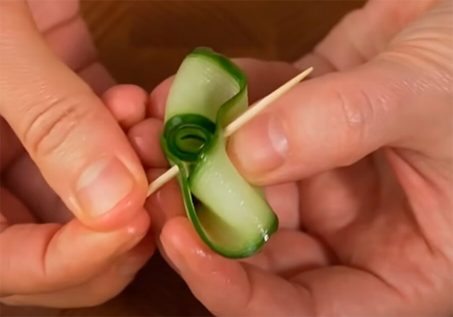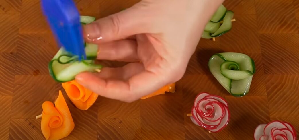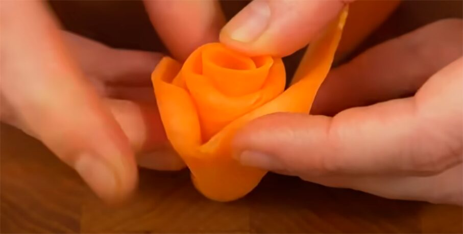Салат є. Тепер його потрібно гідно прикрасити. З морквяних смужечок, які витягніть із розсолу та промокніть паперовим рушником, зробіть троянди. Скручуйте у трубочку одну смужку за одною, час від часу перевертаючи, щоб утворилися пелюстки. Закріпіть низ троянди зубочисткою, а дерев’яні кінчики обріжте ножем, щоб не стирчали. Таким же чином зробіть інші троянди з моркви.