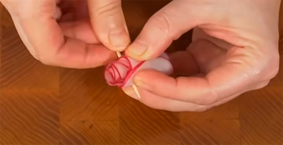 Кружальця редиски викладіть на паперовий рушник. Дайте їм обсохнути. Викладайте одне кружальце на інше нахлистом і загортайте трубочкою. З одного боку зафіксуйте зубочисткою, краї якої відріжте.