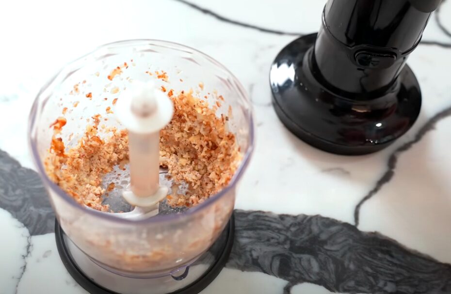 У чашу блендера закладіть обчищені волоські горіхи. Додайте туди ж обчищений зубчик часнику. Влийте оцет. Перемеліть. Заправка має бути вологою, тому влийте ложку води. Постарайтеся зробити так, щоб вона не була рідкою.