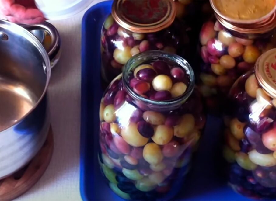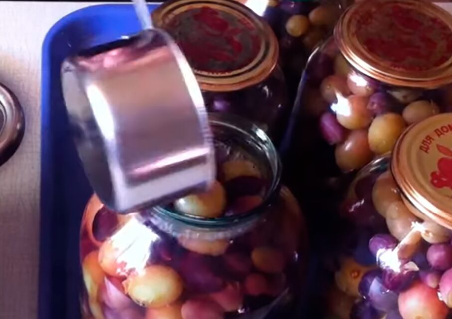 Промийте їх ще раз. Дочекайтеся, поки стече вся вода. Перекладіть у банки, які мають бути сухими та чистими. Закип’ятіть воду й дуже обережно залийте в банки з виноградом. Рідина має покривати їх повністю.