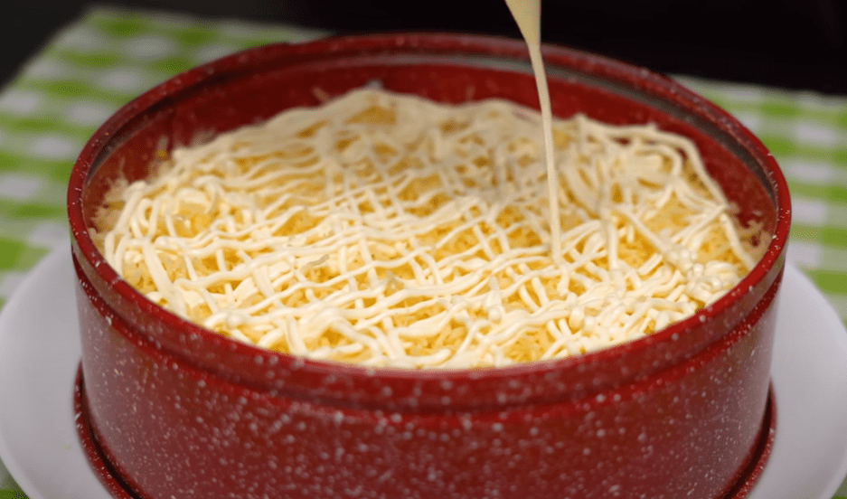 Ще раз відтисніть овоч та викладіть зверху м’яса другим шаром. Майонез тут додавати не потрібно. Обчищені яйця натріть на дрібній тертушці та покладіть зверху огірків. Підсоліть та поперчіть. Зробіть сіточку з майонезу.