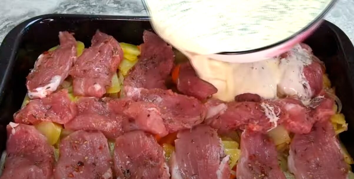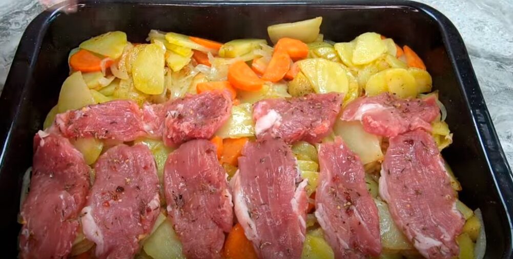 Обчищену цибулину наріжте тонкими півкільцями. Трішки розімніть руками. Додайте цибулю. Присипте чорним меленим перцем та овочевою приправою. Трішки підсмажте й додайте нарізану тонкими півкільцями морквину. Ще трішки підсмажте все разом і перекладіть на деко, розрівнявши. Зверху викладіть шматочки свинини.