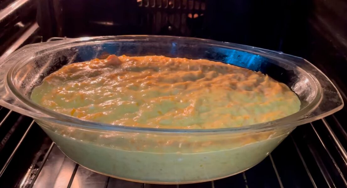Поставте форму туди й випікайте близько 40-45 хвилин. Аби переконатися, що пиріг повністю пропікся, проткніть його дерев’яною шпажкою у декількох місцях. Вона має вийти з тіста сухою.