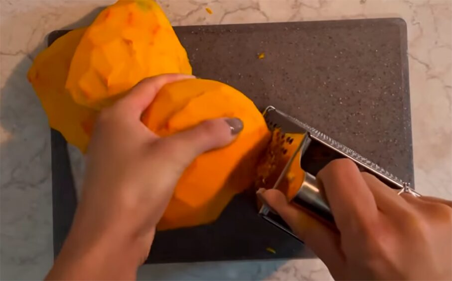 Щоб приготувати ніжний гарбузовий пиріг, змішайте манку з кефіром. Перемішайте до однорідності. Залиште на 15-20 хвилин, аби крупа набубнявіла. Тим часом обчистьте гарбуз від шкуринки та видаліть насіння. Натріть овоч на дрібній тертушці.