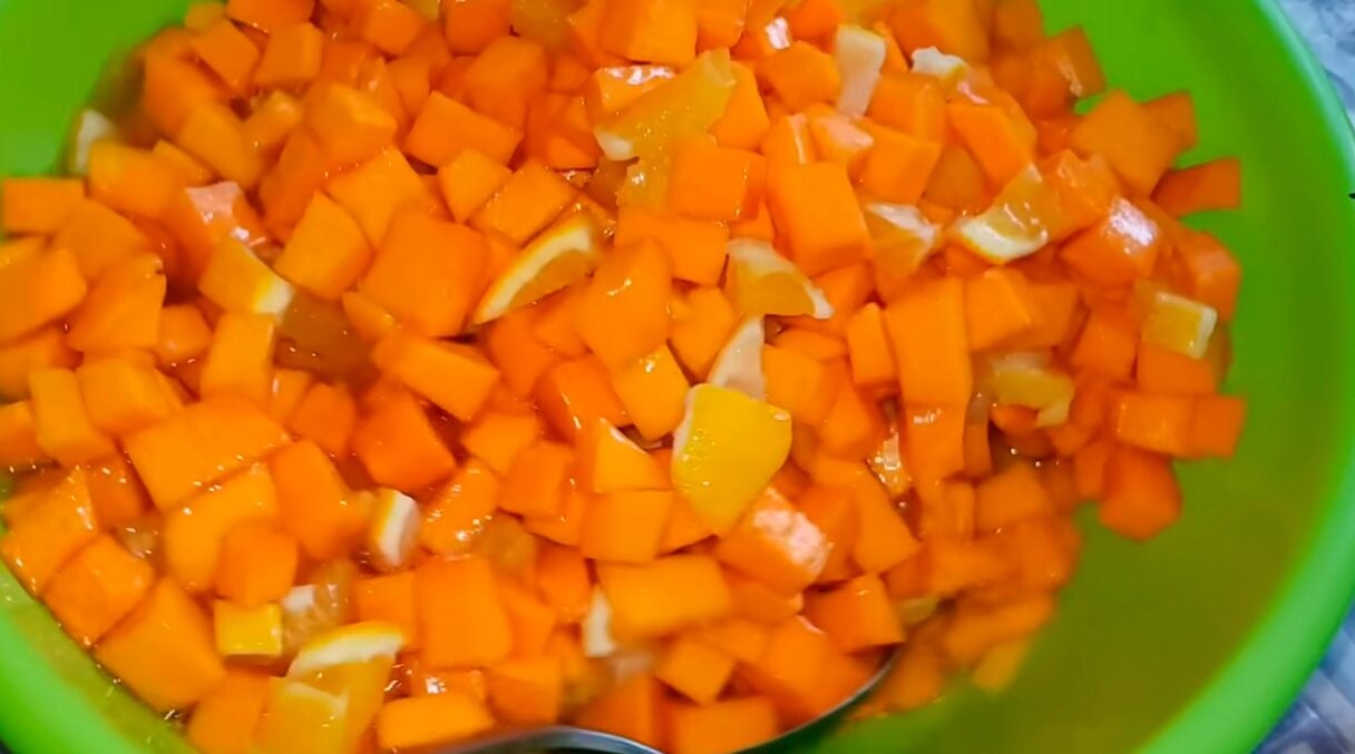 За цей час апельсини й лимон пустять сік та ретельно просочать шматочки гарбуза. Час від часу перемішуйте масу, аби пришвидшити процес насичення смаком. Шматочки цитрусових після цього виберіть в окрему місткість, а овочеві розкладіть по простерилізованих банках та залийте рідиною, що виділилася.