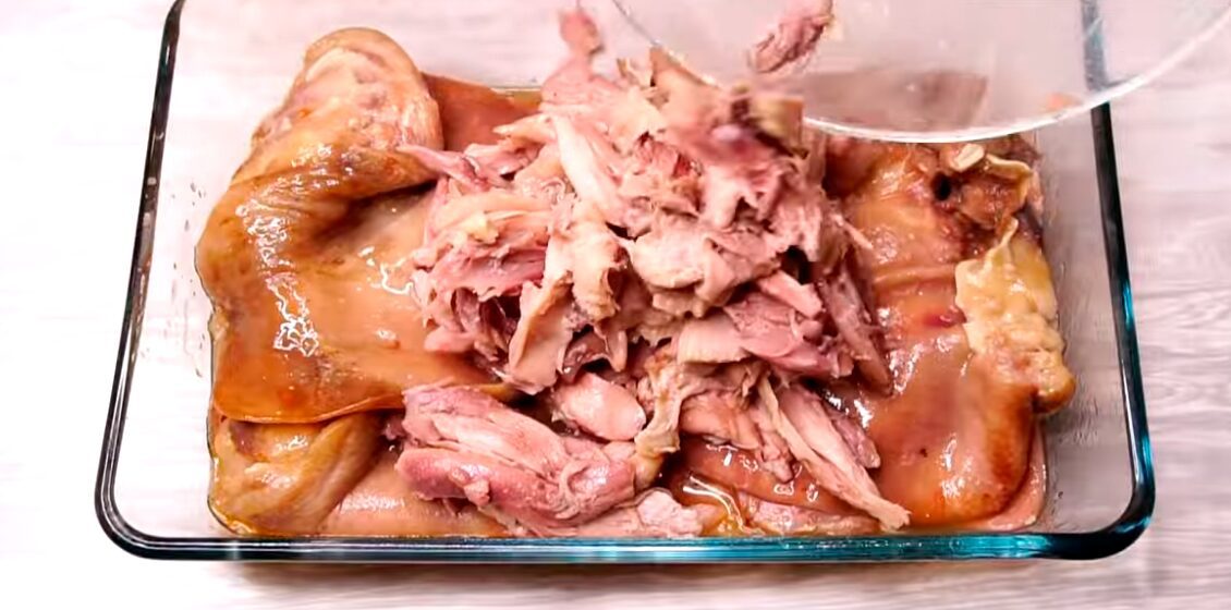 Куряче м’ясо відділіть від кісточок. На дно форми влийте 2 ложки часникового бульйону. Викладіть половину вух. Зверху розкладіть половину шматочків стегенець. Налийте ще 2 ложки бульйону. Далі – знову вушка й знову курятина.