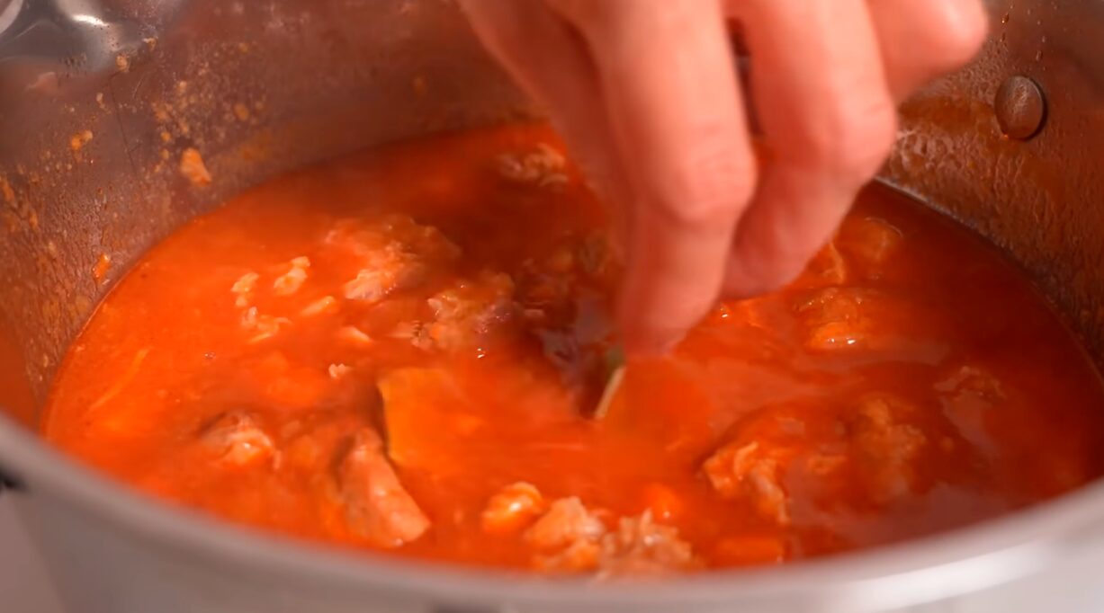 Якщо соус видається вам занадто рідким, можете відкрити кришку й зачекати, допоки рідина трохи випарується. За 10 хвилин до готовності покладіть у каструлю лавровий лист та подрібнений часник.