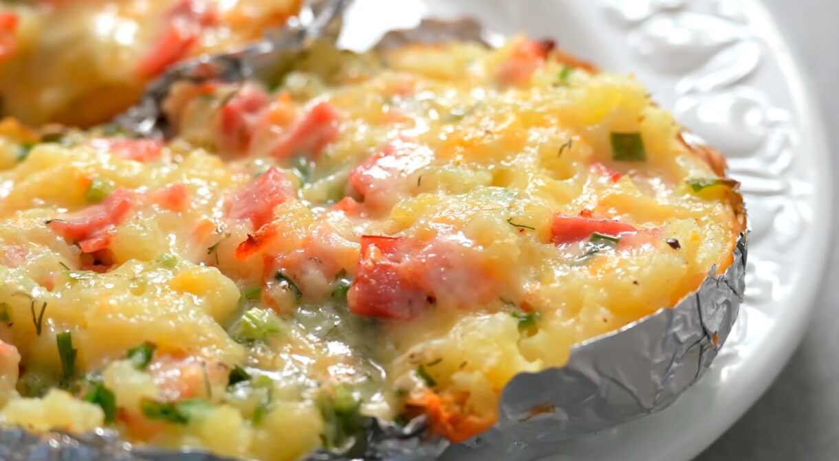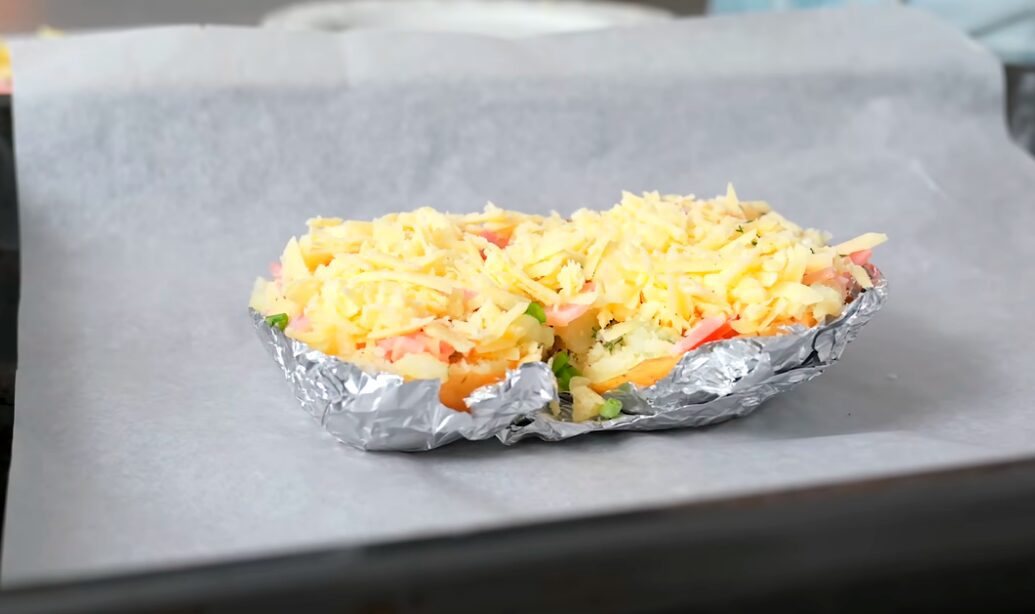 Додайте шматочок вершкового масла. Воно почне танути, тож зможете перемішати вміст. Викладіть шматочки бекону та натертий сир. Таким же чином вчиніть і з двома іншими картоплинами.