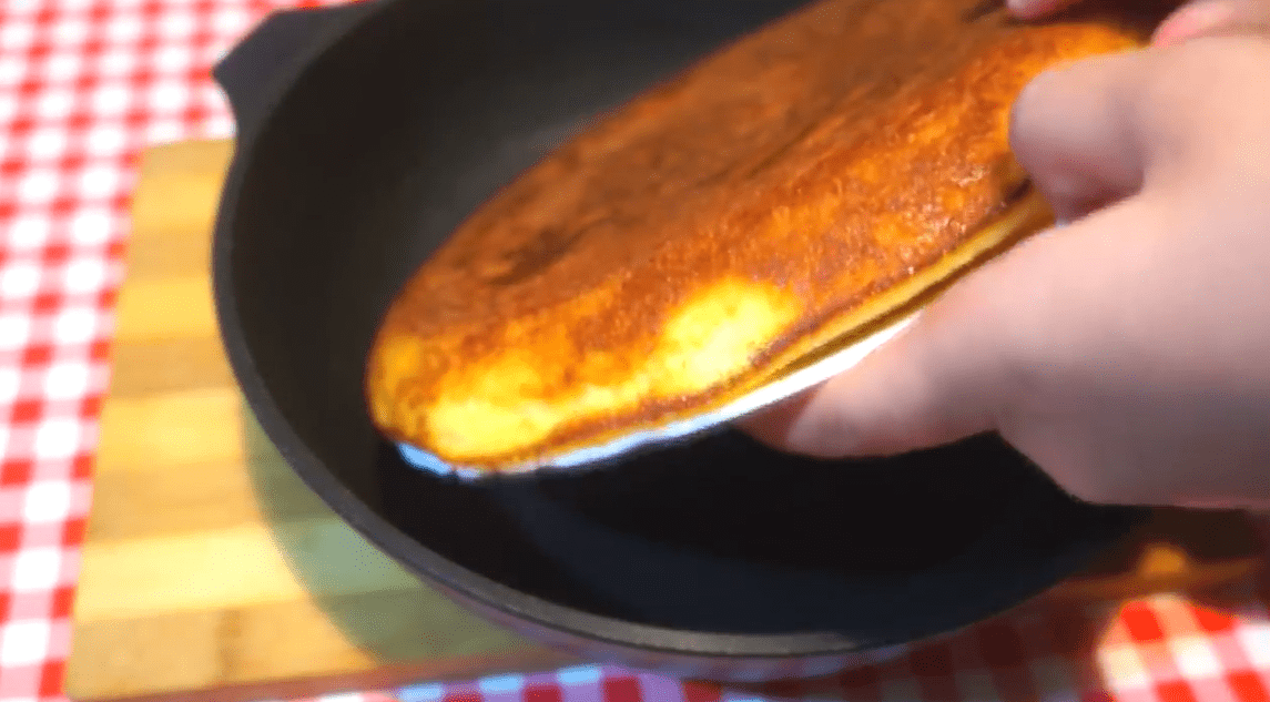 Тісто залишиться на тарілці. Акуратно поверніть його на сковорідку. Випікайте ще близько 10 хвилин під кришкою. Вимкніть вогонь і знову переверніть манник на тарілку. Можете розрізати на порції та подавати до чаю чи кави.