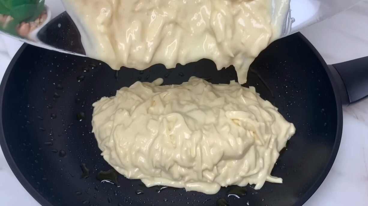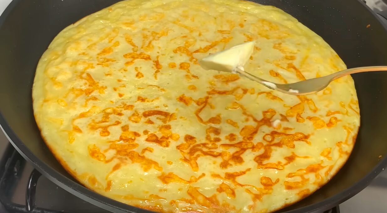 Вилийте в неї тісто. Похилитайте, щоб розійшлося рівномірно. Поставте на найслабший вогонь та накрийте кришкою. За 15 хвилин низ ущільниться та підрум’яниться. Тепер наше хачапурі переверніть на інший бік.