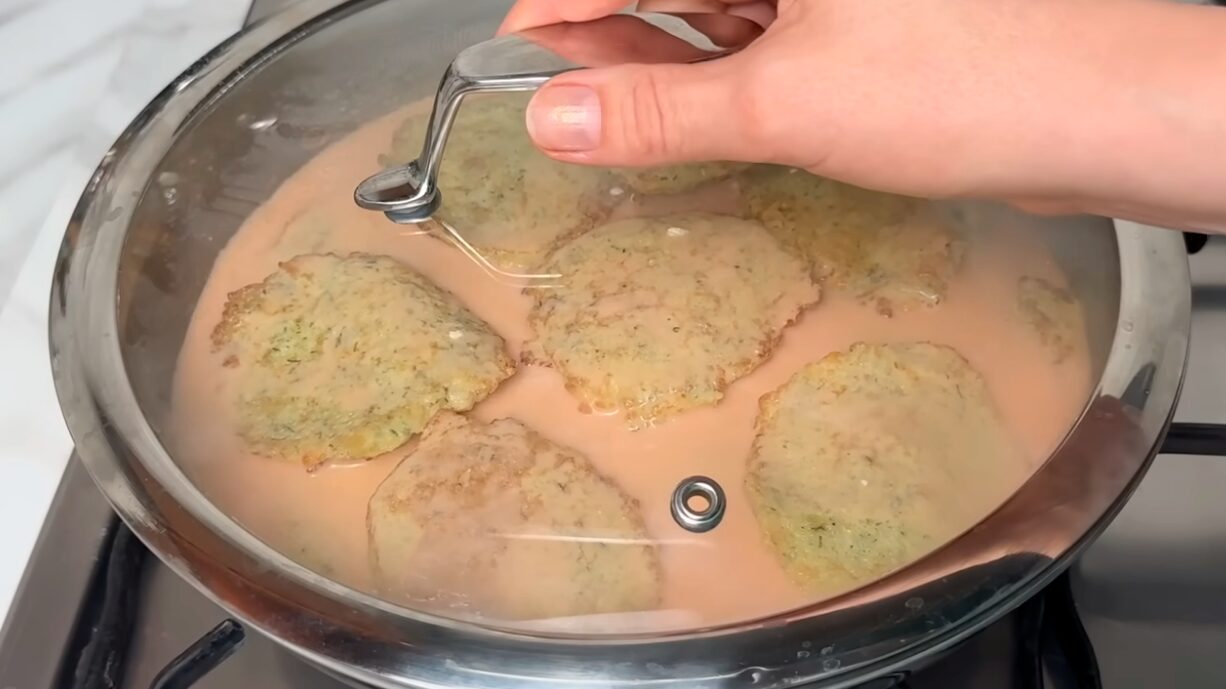 Залийте до верху теплою водою. Посоліть та перемішайте. Поверніть готові цибуляники на пательню й залийте отриманим соусом. Тушіть під кришкою протягом 5 хвилин. Так наші вироби стануть ще ніжнішими та смачнішими. Такий сніданок вийде не лише несподіваним та ароматним, а ще й корисним.