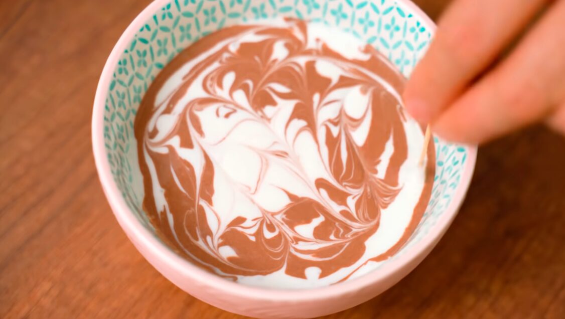 Какао змішайте з однією ложкою сметани, щоб не було грудочок. Тепер перекладіть шоколадну масу до другої частини сметани. Збийте міксером до пишності. Додайте половину желатину у шоколадну масу, а другу – у ванільну.