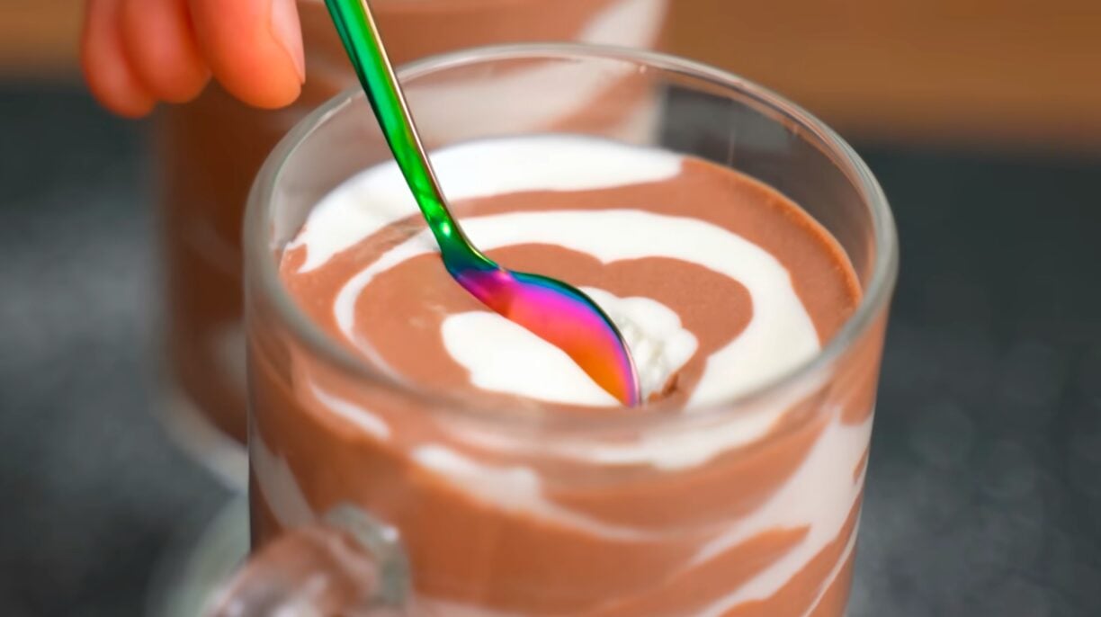 Збийте обидві маси по окремо міксером, щоб желатин рівномірно розподілився. Візьміть склянки чи прозорі формочки. Викладайте в них почергово шоколадний та ванільний мус. За бажанням, зубочисткою зробіть на поверхні якийсь абстрактний малюнок.
