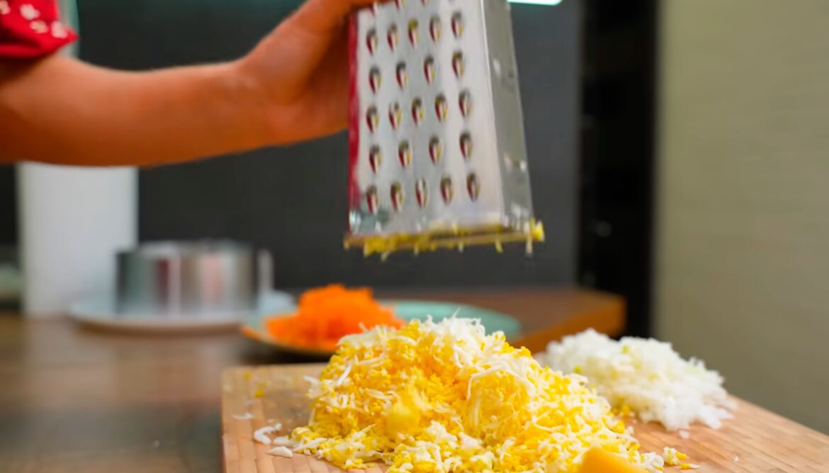 Яйця попередньо відваріть круто. Вони мають прохолонути. Обчистьте їх та натріть на дрібній тертці. Твердий сир теж натріть на цій же тертушці. В останню чергу беріться до яблука.