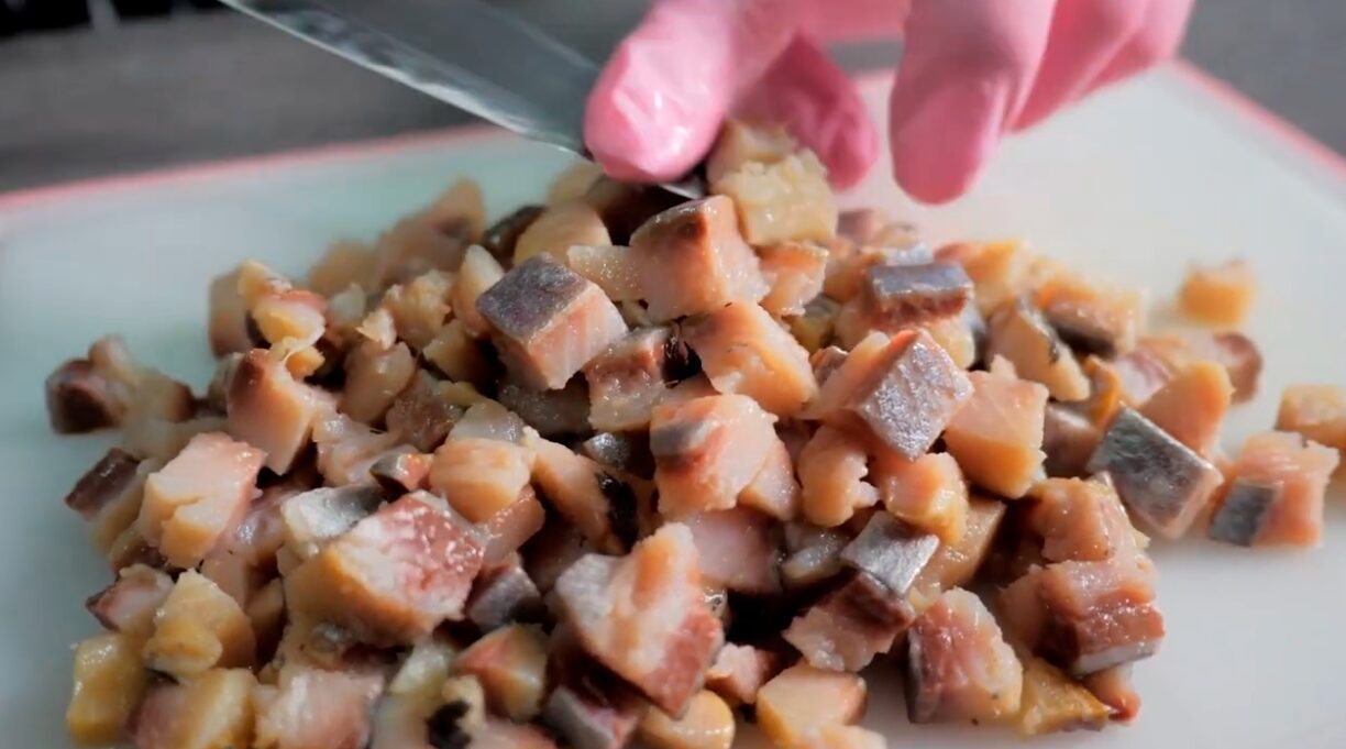 Філе оселедця наріжте такими ж шматочками, як і решту продуктів. Змішайте з загальною масою. Тим часом уже підсмажився хліб. Дістаньте форму з духовки й залиште, щоб прохолонула.