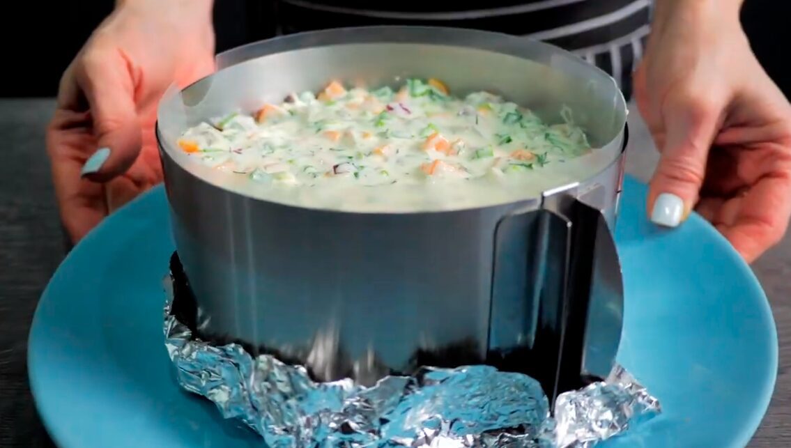 Перекладіть на основу з хліба. Виходить дуже яскраво й гарно. Відправте до холодильника на 4-5 годин. Можете залишити застигати на всю ніч. Після цього акуратно зніміть кільце, від’єднайте плівку. Прикрасьте верх оселедцевого торта на власний смак.