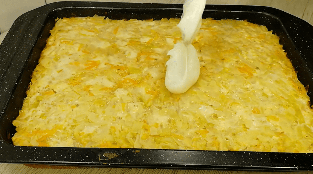 Форму 30х20 см змастіть маслом. Перекладіть капустяну масу туди. Трішки утрамбуйте. Гарненько розрівняйте верх. Накрийте фольгою та випікайте 30 хвилин за температури 180 градусів. Фольгу зніміть, а верх запіканки змастіть сметаною.