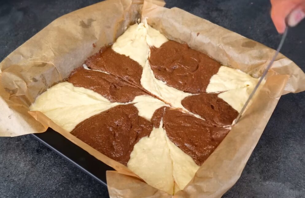 В одну з них всипте какао й розмішайте. В іншу для рівноваги додати стільки ж борошна. Форму розмірами 23х23 см вистеліть папером для випічки. Викладайте ложкою біле й темне тісто у шаховому порядку.