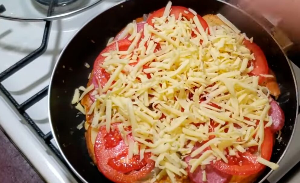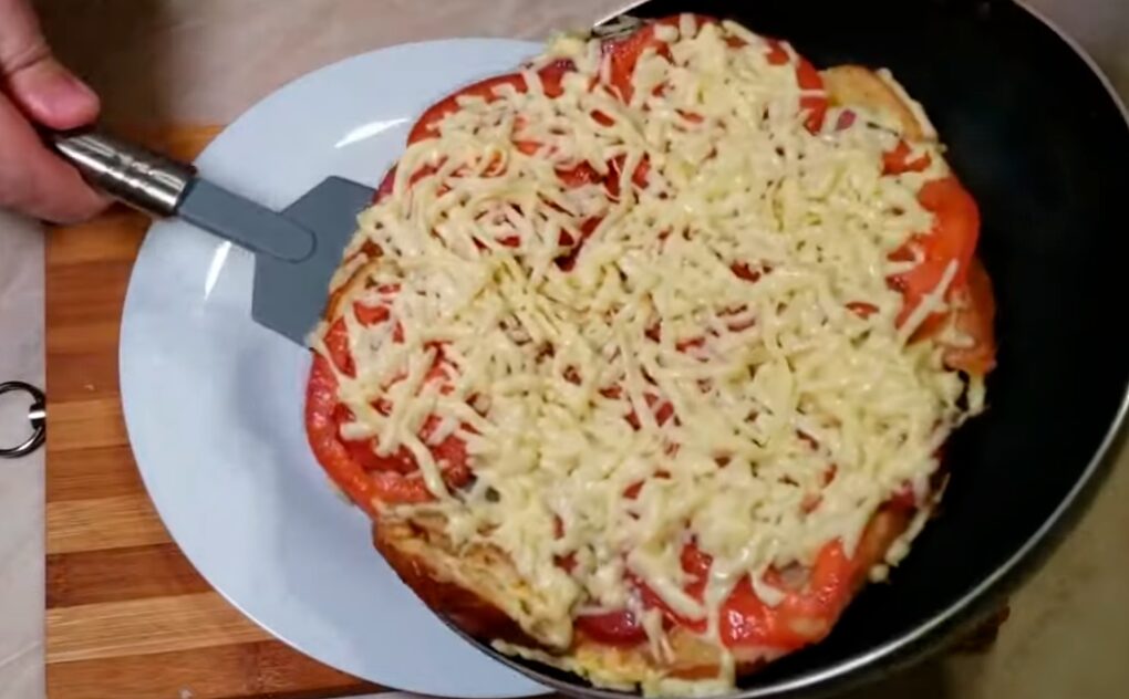 Накрийте кришкою і лише тепер знову увімкніть плиту. Накрийте кришкою. Тримайте на повільному вогні 3-4 хвилини. Сир має повністю розплавитися. Акуратно перекладіть ліниву піцу на тарілку й можете подавати до столу.