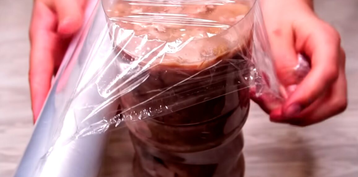 2-літрову пластикову пляшку позбавте верхньої частини. Заповніть м’ясом цю місткість. Притисніть ложкою, щоб не залишилося пустот. Затягніть верх харчовою плівкою та відправте до холодильника.
