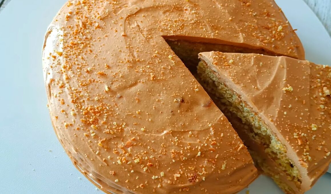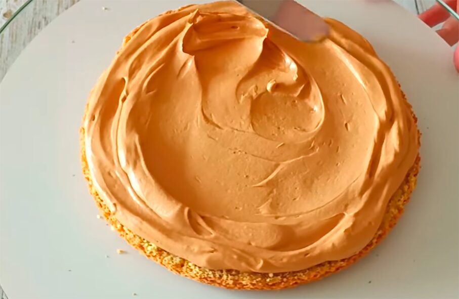 Бісквіт розріжте навпіл, щоб вийшло 2 коржі. Розповсюдьте крем по поверхні одного коржа. Накрийте другим. Змастіть верх і боки, не натискаючи, щоб з середини крем не виходив назовні. Присипте верх торта бісквітною крихтою.