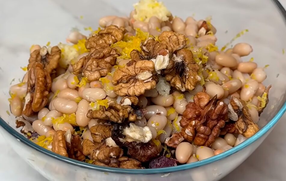 З лимона зніміть цедру. Попередньо цитрус ретельно вимийте. Можна навіть з содою. Намагайтеся не чіпати білу частину шкірки, лише жовту, щоб не було присмаку гіркоти. Додайте у миску ще й волоські горіхи або кунжут.