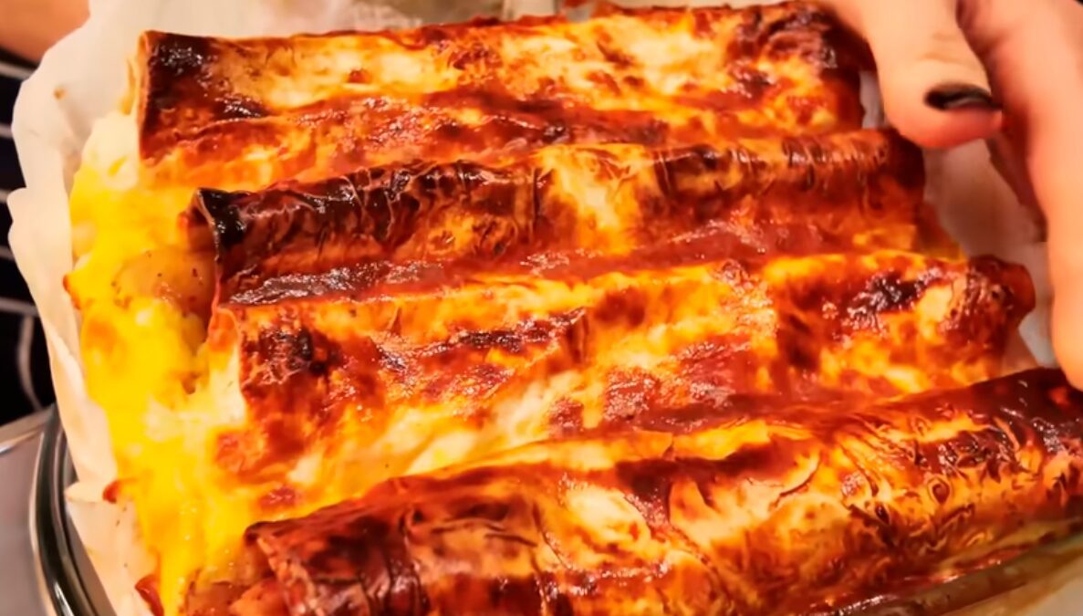 Тепер беріться до приготування заливки. Вбийте у мисочку яйця. Додайте сметану та розколотіть виделкою. Можете всипати дрібку солі. Вилийте зверху на пиріг. Розподіліть по верхньому ряду трубочок.