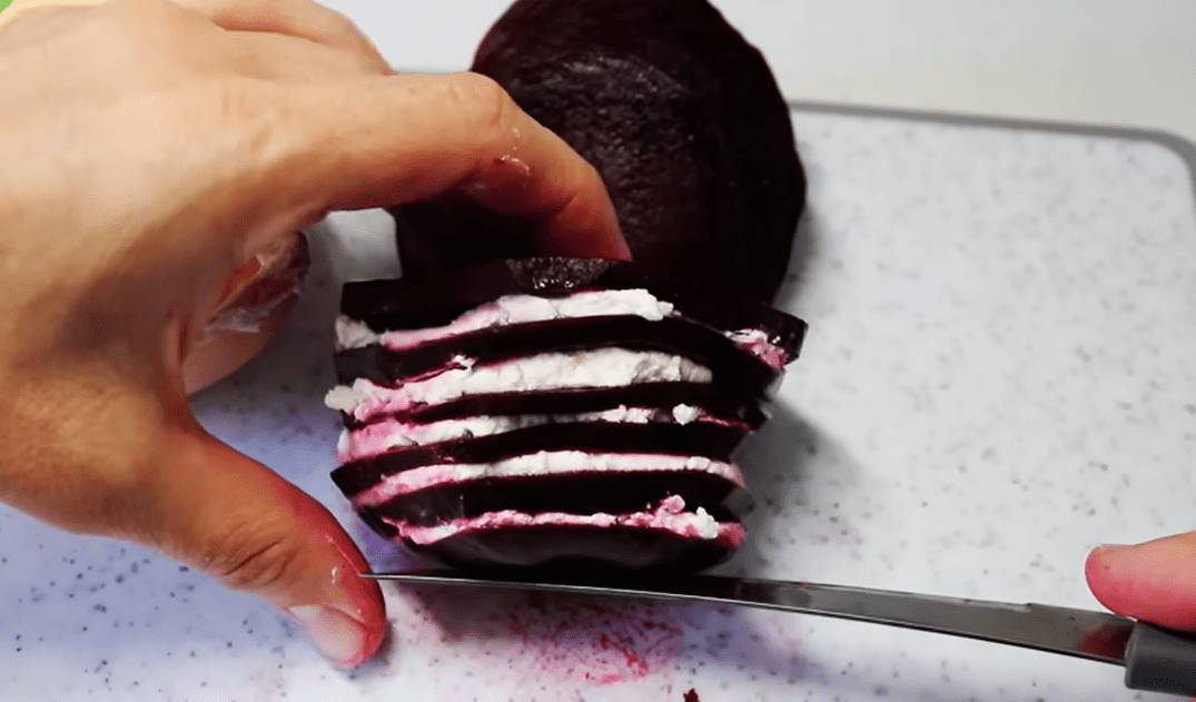 Щоб приготувати святковий салат зі смугастого буряка, овоч відваріть до готовності, обчистьте та наріжте тоненькими слайсами. Кожен шматочок намастіть м’яким вершковим сиром та викладіть один на один, наче збираєте бурячки назад ціленькими.