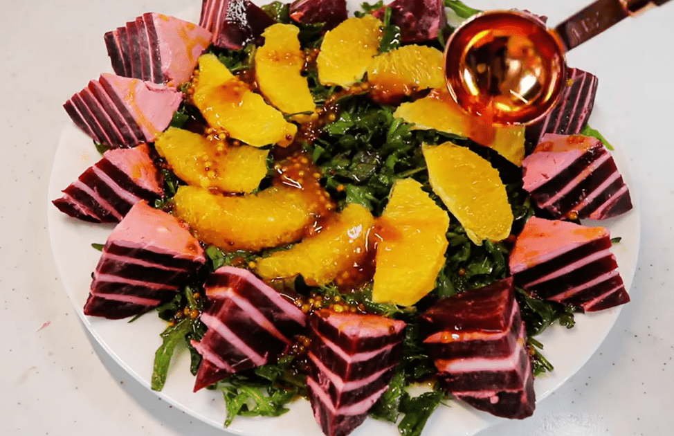 Дістаньте смугасті бурячки. Наріжте їх на шматочки та розкладіть поверх зелені. Далі часточки апельсина, кубики сиру. Зверху конструкцію притрусіть підсмаженим мигдалем. Полийте рештками соусу та прикрасьте пір’ям зеленої цибулі. Салат зі смугастого буряка виходить настільки яскравим, що хоч на виставку неси.
