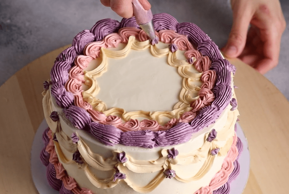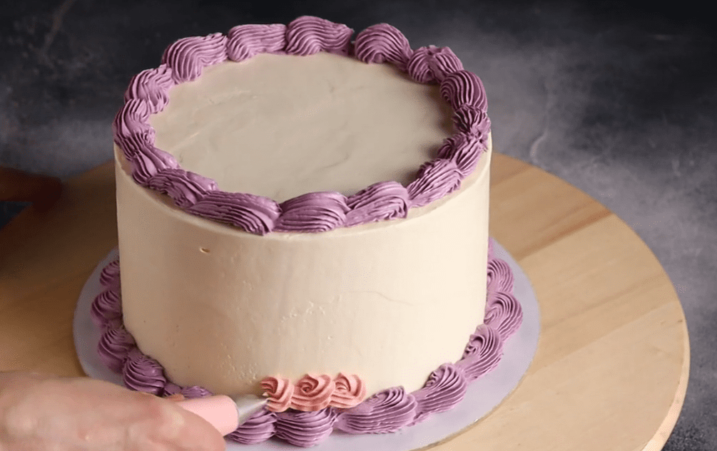 А от на рюші й оборки з крему та оздоблення декором не скупіться. Закладіть у кондитерський шприц бузковий крем та поставте найбільшу насадку. Пройдіться по низу торта. Рука має рухатися, не відриваючись.
