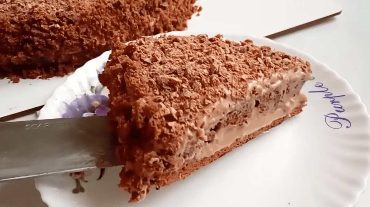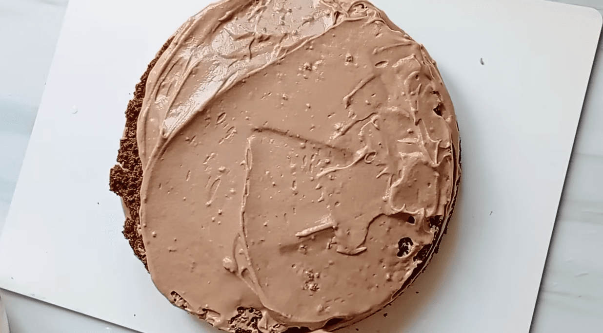 Накрийте другим коржем. Намастіть другою половиною крему, заразом змастивши й боки. Обрізки бісквіта перетворіть на крихти та присипте наш шоколадний тортик зверху та з боків.
