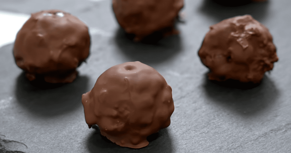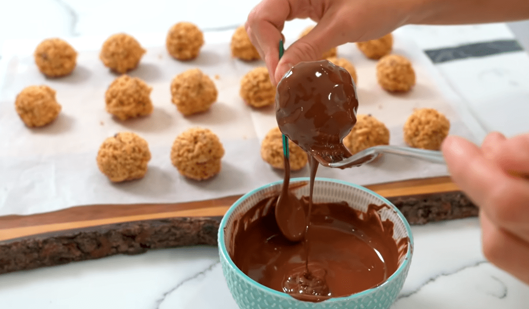 Дістаньте й перемішайте та знову поверніть до мікрохвильовки. Робіть так кілька разів, допоки шоколад не розтопиться повністю. Тепер вмочайте кожну горіхову цукерку у шоколад і викладайте на пергамент, щоб застигав.
