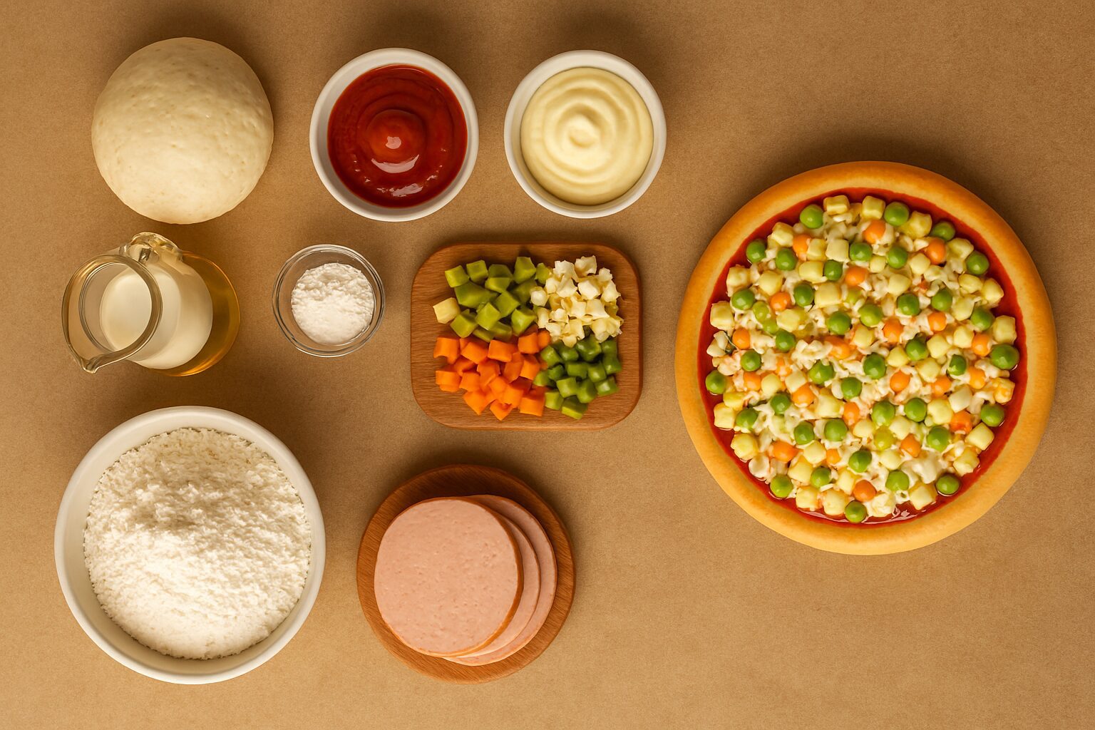 Додайте нарізану кубиками варену ковбасу та солоні огірки. Всипте консервований зелений горошок. Заправте майонезом та перемішайте. Основу з тіста щедро змастіть кетчупом.