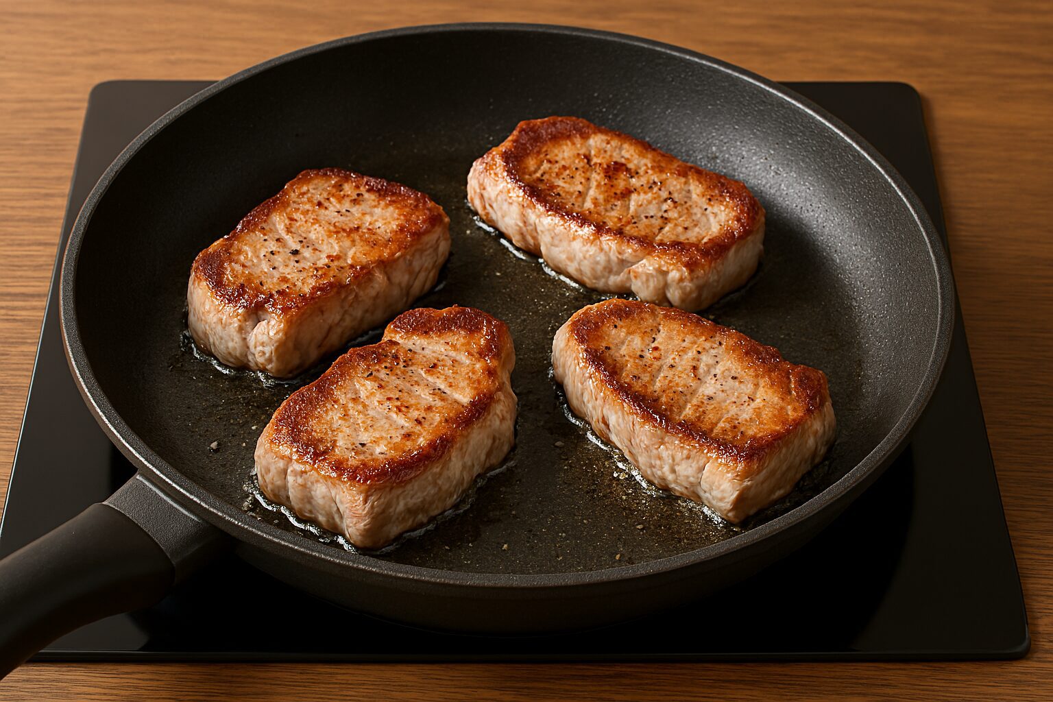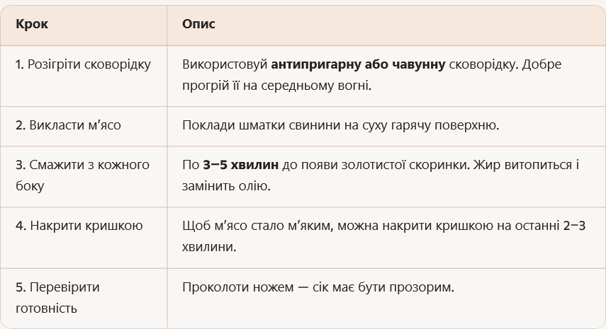 Найжирніші частини свинячої туші бажано смажити без додавання рослинного жиру. Просто викладаєте м’ясо на суху сковорідку, бажано з антипригарним покриттям, і воно саме напустить купу жиру. Ще й апетитна скоринка утвориться.