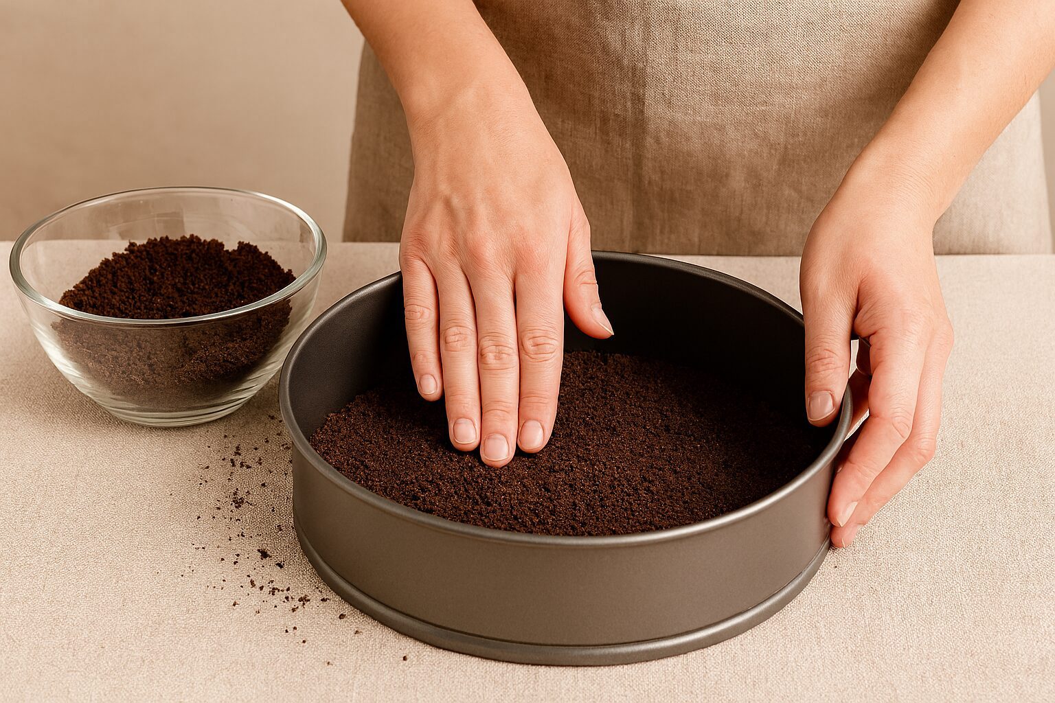 Щоб приготувати торт за лічені хвилини без духовки, скористаємося для основи шоколадним печивом. Подрібніть його на крихту. Якщо світла немає й запустити блендер не можете, складіть печиво у цупкий пакет та пройдіться по ньому качалкою.