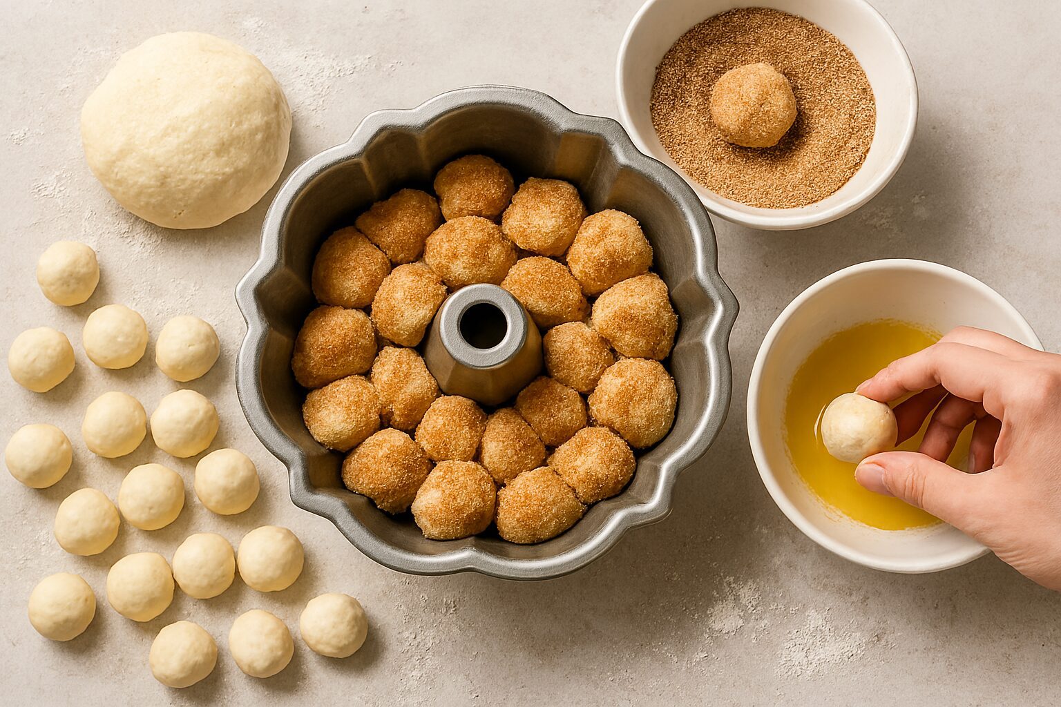 Форму для випікання змастіть олією. Викладіть кульки шарами. Можете за бажанням додати родзинки чи горіхи, розкладаючи їх між елементами Мавпячого хліба. Накрийте напівфабрикат рушником і залиште ще на пів години чи й годину.