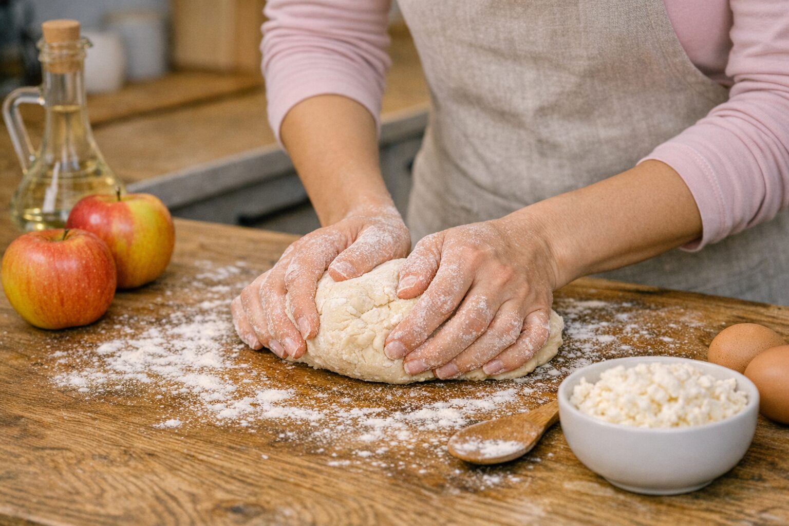 Перемішайте інгредієнти й починайте потроху додавати борошно. Можливо, його знадобиться трішки менше, аніж вказано у рецепті. Дивіться по ситуації. Тісто має вийти м’яким. Накрийте його харчовою плівкою та відправте до холодильника на 20 хвилин.