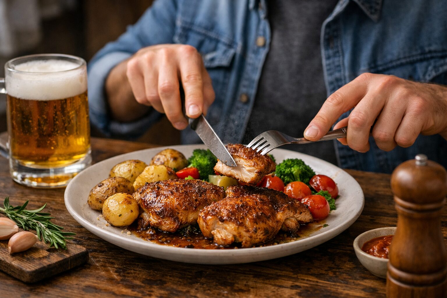 Курячі стегна завтовшки до 2 см доведеться потримати на вогні дещо довше – по 6-7 хвилин з обох боків. Спочатку гарненько підрум’яньте, а потім доведіть до готовності під кришкою.