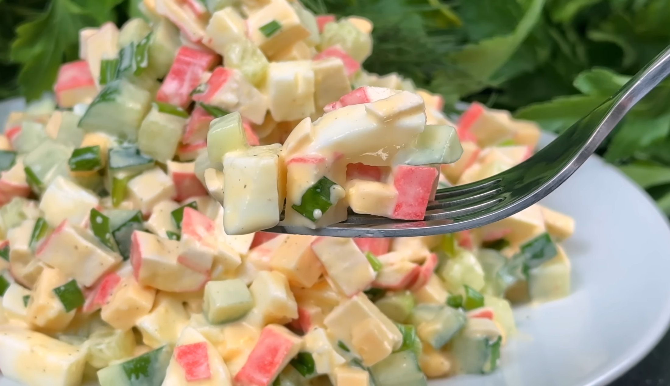 Навесні хочеться скуштувати чогось легкого й ніжного. Тож візьмемся за приготування салату з огірків та крабових паличок. Якщо завчасно відварити яйця, то впораєтеся з наїдком за 5 хвилин.