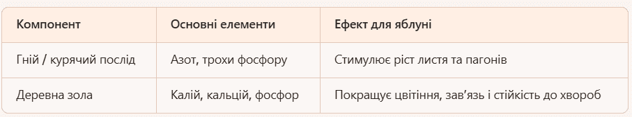 Щоб приготувати рідке добриво для яблуні, використовуйте виключно органіку. Це може бути курячий послід або коров’ячий гній. А ще вам придасться деревна зола. Ці натуральні компоненти здатні наситити дерево усім необхідним – азотом, кальцієм та калієм.