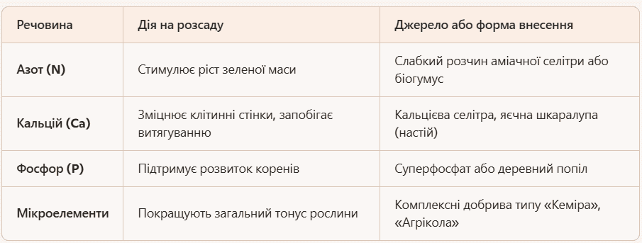 Аби розсада зміцнішала, а стебла стали товстішими, для неї потрібно підготувати підгодовування. Вперше це робіть, щойно на росточках з’являться 2-3 справжніх листки. Сім’ядольні не враховуйте.