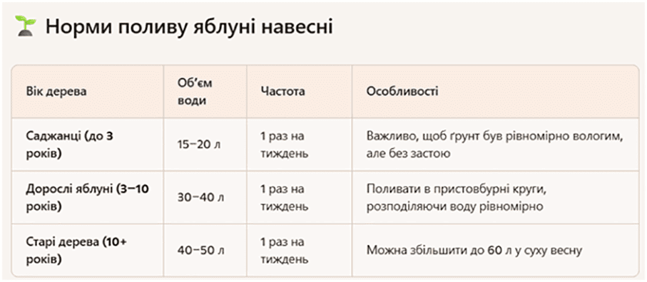 Навесні треба обов’язково планувати серед інших городньо-садових робіт ще й полив яблуні. Якщо дерево старе, то потрібно вливати під нього 4-5 відер. Доросле середнього віку потребує 3-4 відер. Якщо саджанець молодий – достатньо буде 15-20 л.
