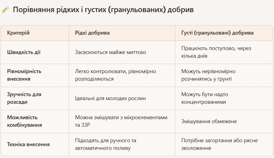 Рідкі добрива краще засвоюються молодими рослинами, а щоб подіяли густі, треба ще зачекати декілька днів. Якщо готуєте поживну рідину, маєте можливість поєднати кілька компонентів, з гранульованими такого не відбудеться.