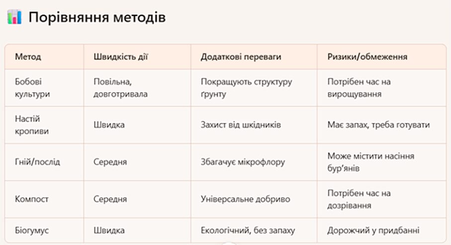 Це швидкі методи насичення ділянки азотом, що потрібен городині на перших етапах розвитку зелені. Якщо розсипати в міжряддях компост чи додавати це органічне добриво під час перекопування, то відбудеться повільне поступове підживлення протягом усього сезону.