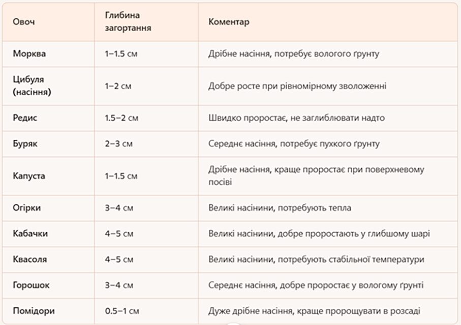 Для оптимальної схожості та зростання рослин заглиблюйте в землю на 2-3 розміри насінини. Досвідчені городники пропонують дотримуватися таких параметрів посіву.
