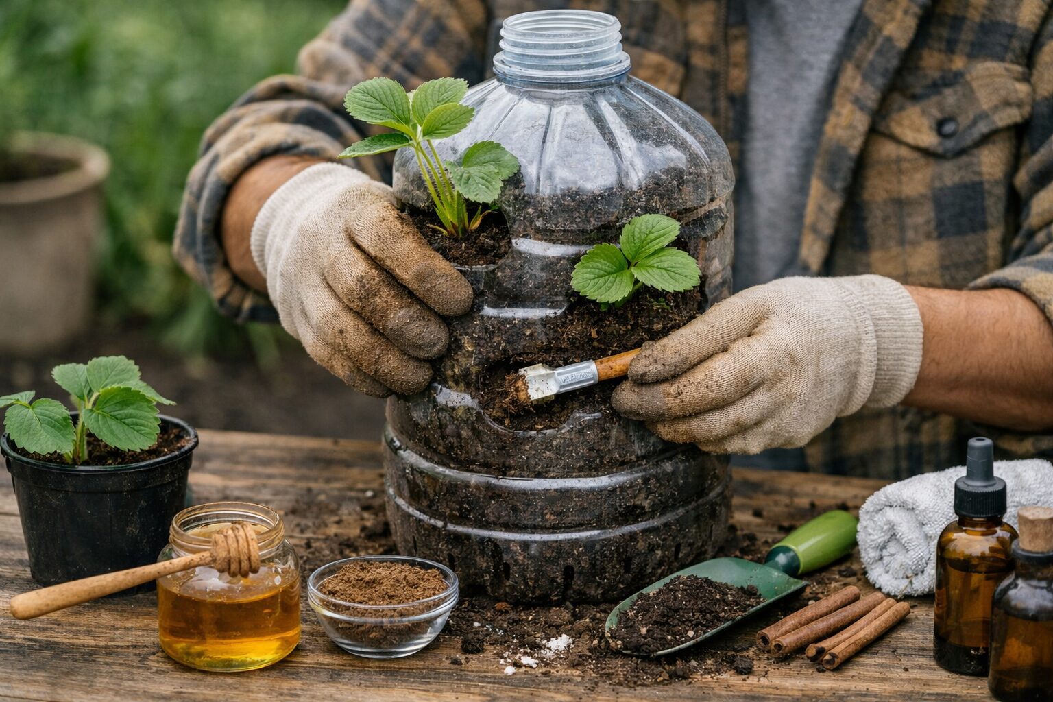 По мірі наповнення пляшки субстратом на рівні отворів висаджуйте розсаду полуниці. Суміш краще робити з торфу, перегною та садової землі. Бажано обирати ремонтантні сорти.