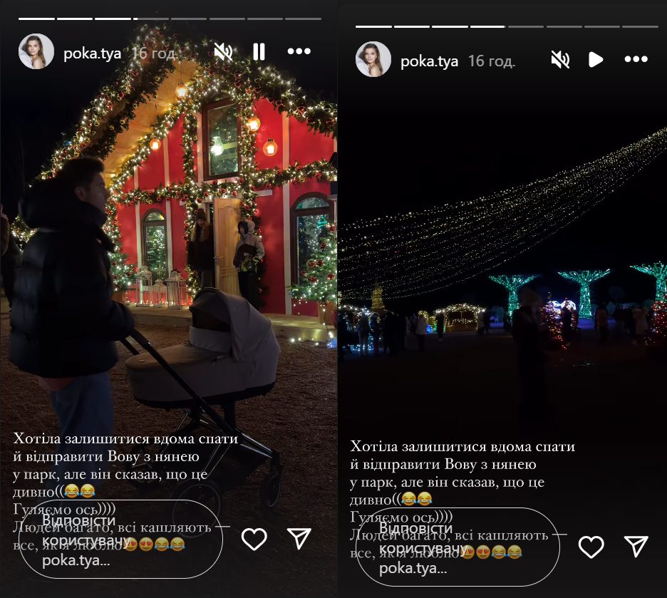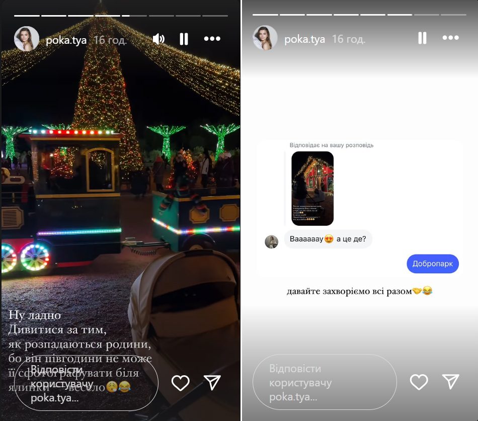 24-річна молода мама Катя Полтавська продовжує радувати підписників свого Інстаграму, викладаючи Сторіз. На цей раз черга дійшла до чарівної прогулянки казково вбраним Добропарком.