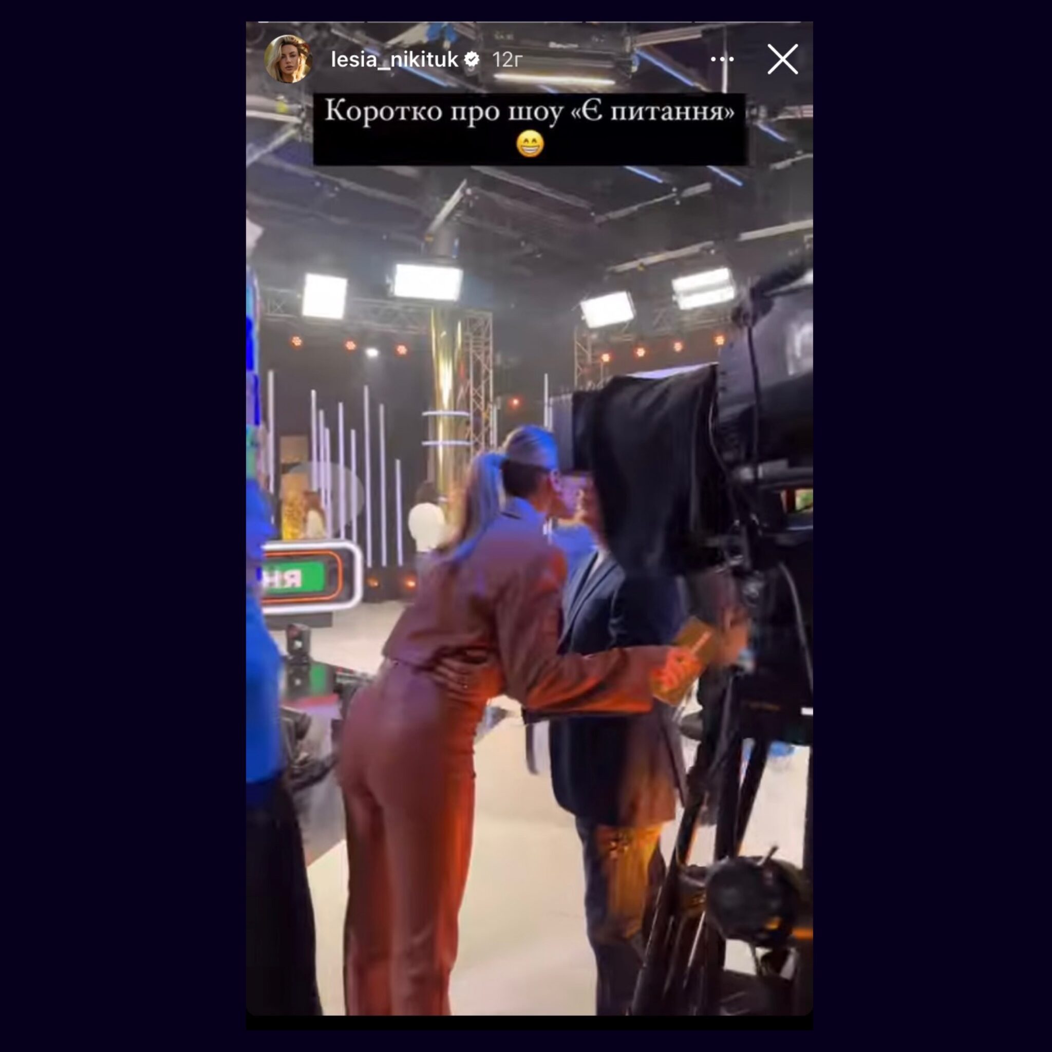 Всі вважають телеведучого взірцем сімейної ідилії. Він обожнює свою дружину Катю Осадчу, яка народила йому двох синочків. А незаміжня Леся дозволила собі непристойність стосовно колеги. Під час знімання шоу “Є питання” ведучі поводилися пристойно, а от коли залишилися поза камерою, Нікітюк раптово поцілувала чужого чоловіка в губи.