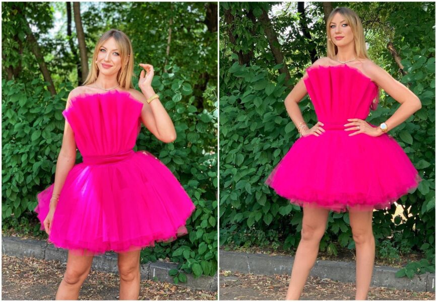 Сукня досить коротка і підкреслює довгі та стрункі ноги телеведучої. При цьому плаття пишне і повітряне, як у ляльки Барбі. Прихильники Нікітюк зійшлися на думці, що їй дуже пасує рожевий колір.